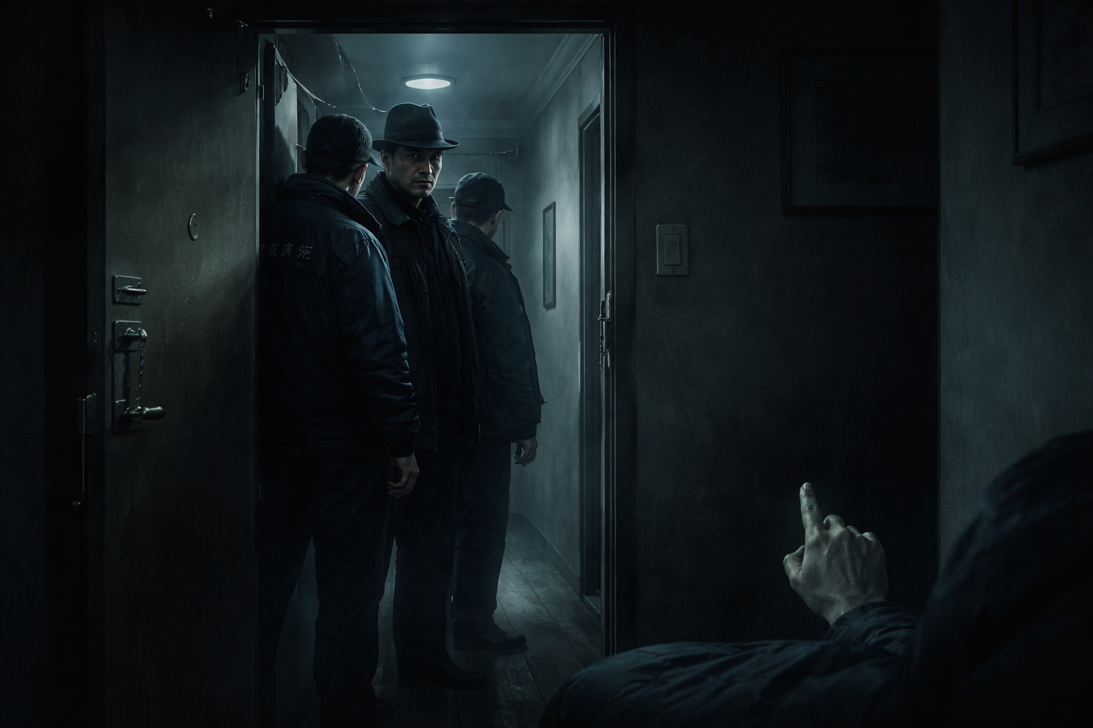 甲高い音が、休日の静まり返った廊下に不自然に反響した。足音を殺して覗き窓に目を寄せる。紺色のジャンパーを揃いで着た三人組が、玄関灯の下に立っていた。胸板の厚い体格。無精髭。営業の笑みはなく、ただ立っているだけで空気が重い。