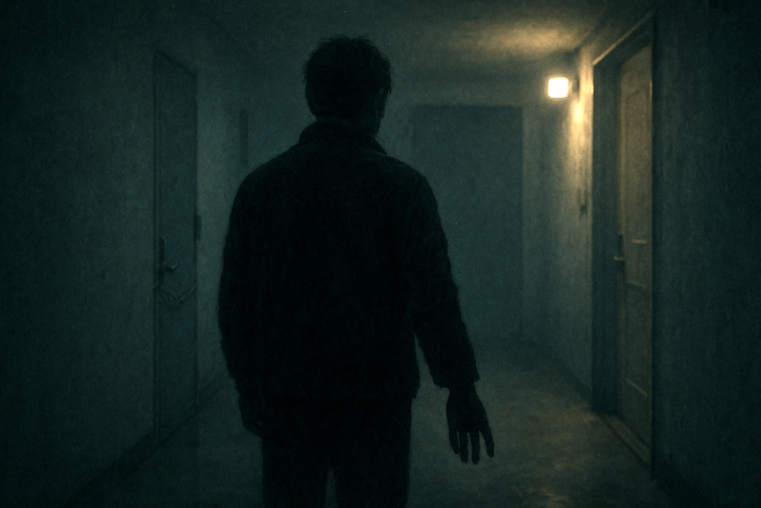 廊下には、二つの扉に挟まれる形で影が立っている。顔は見えない。ただ、右手だけがかすかな灯りを拾って白く浮き上がり、欠けた二本の指が真っ直ぐにこちらを指していた。