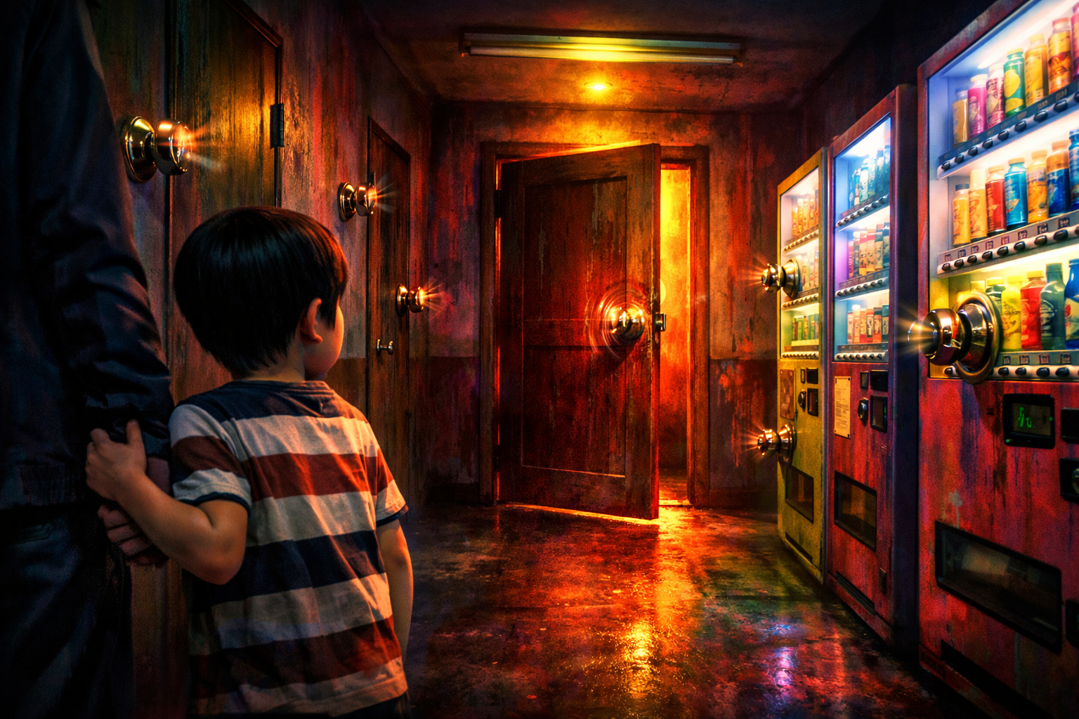 着いたのは、灰色の古びたビルだった。入口のランプが弱々しく灯り、内部は洞窟のように暗い。母の手を握ったが、すぐに引き離された。数人の子どもたちと一緒に、窓のない部屋へ通される。親たちは別の場所へ消えた。