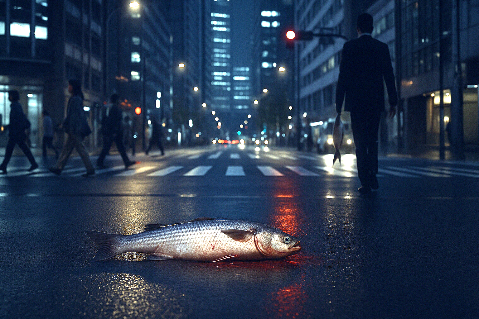そのとき、ひとりのサラリーマン風の男が足を止めた。黒いスーツにネクタイという、どこにでもいそうな中年。そいつはしゃがみこみ、潰れたボラを片手でひょいとつかみあげた。ぶら下げたまま、ゆっくりと歩き出し、雑踏の向こうへ消えていった。