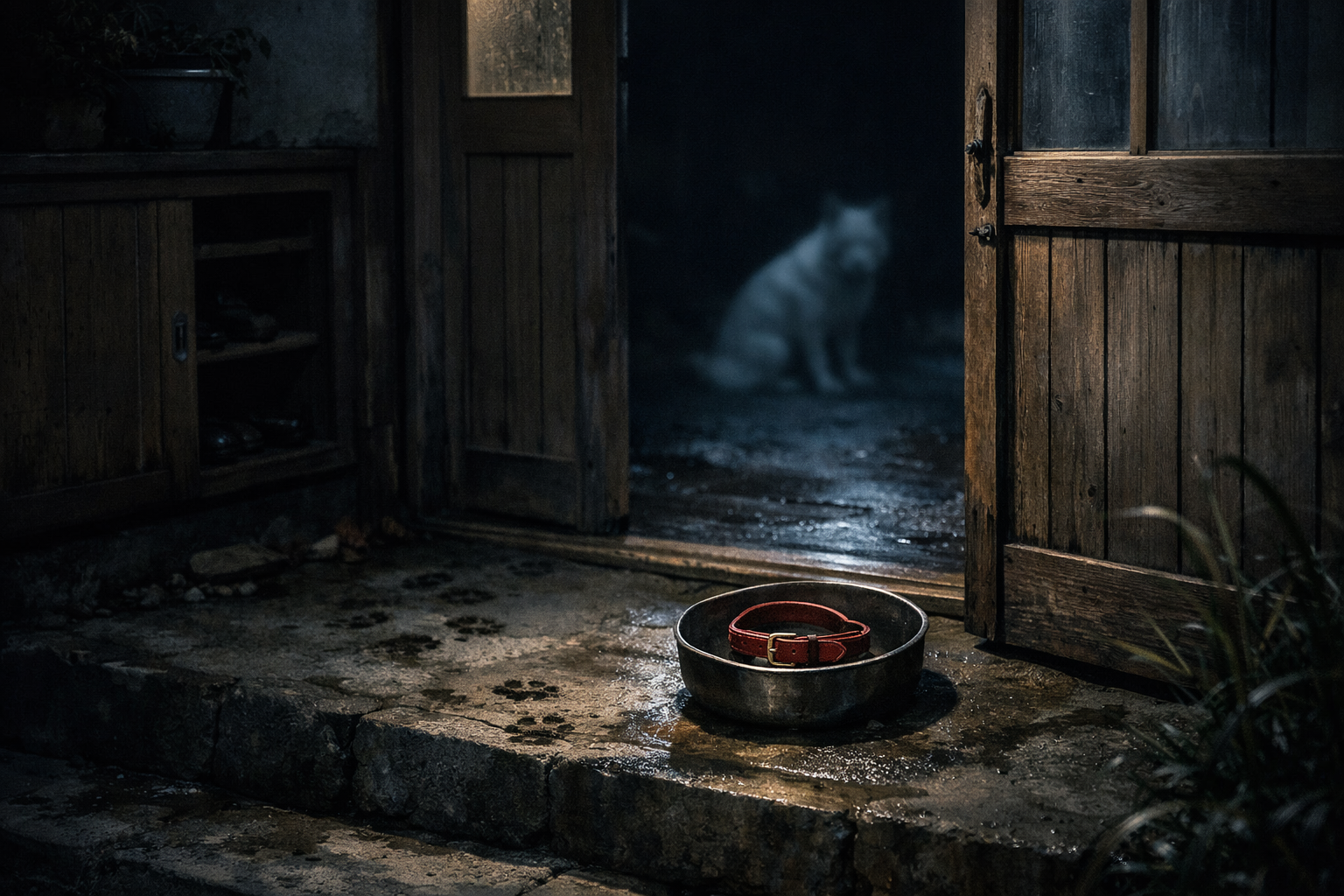 敷いていた毛布だけが少しずれていて、餌皿の上に首輪が丸く置かれていた。赤い革の裏に、泥とも煤ともつかない黒い汚れが指の跡みたいについていた。動けるはずがない。持ち上がれるはずもない。祖父はすぐに庭を見に出たが、足跡はなかった。