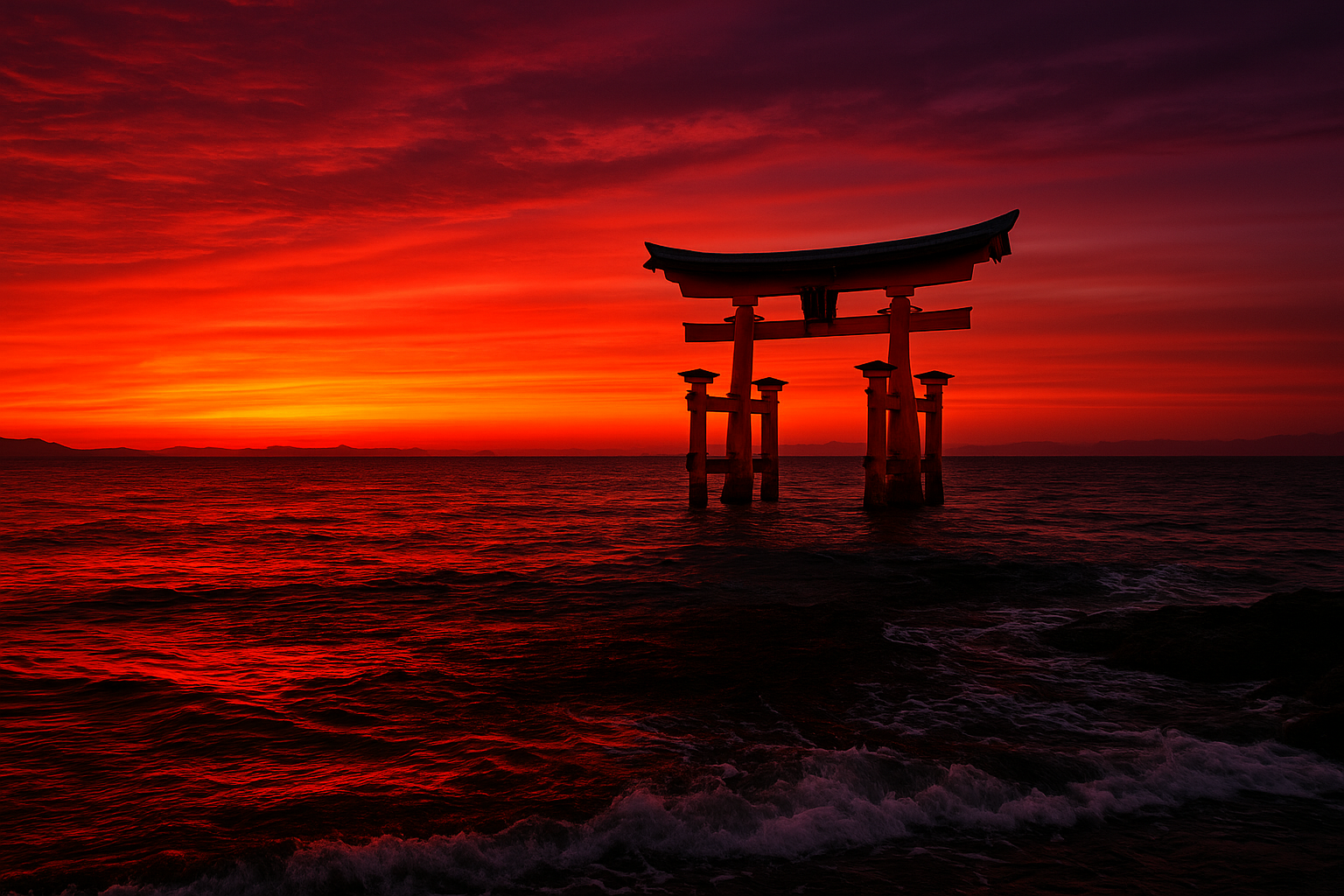 夕日が水平線に沈もうとしており、その光に鳥居が照らされて、まるで写真のように美しかったという。
