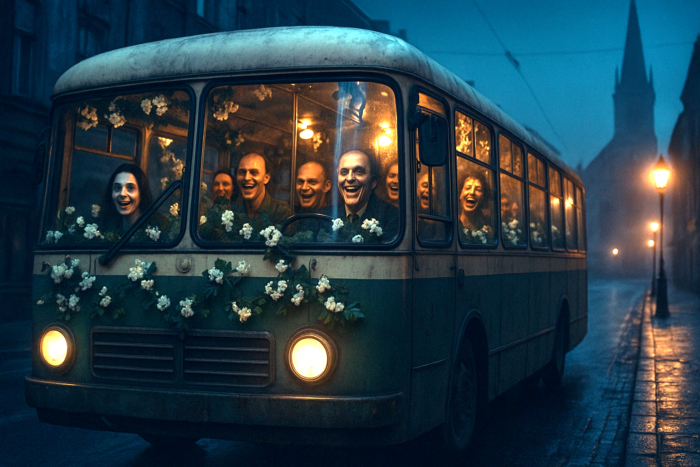 乗客はきれいに二つに分かれていた。片側には、煤を浴びたみたいに暗い顔の連中が、俯いたまま揺られている。もう片側には、笑いすぎて頬の筋が固まったような連中がいて、誰もが大声で歌い、手を叩き、隣の肩を抱いていた。