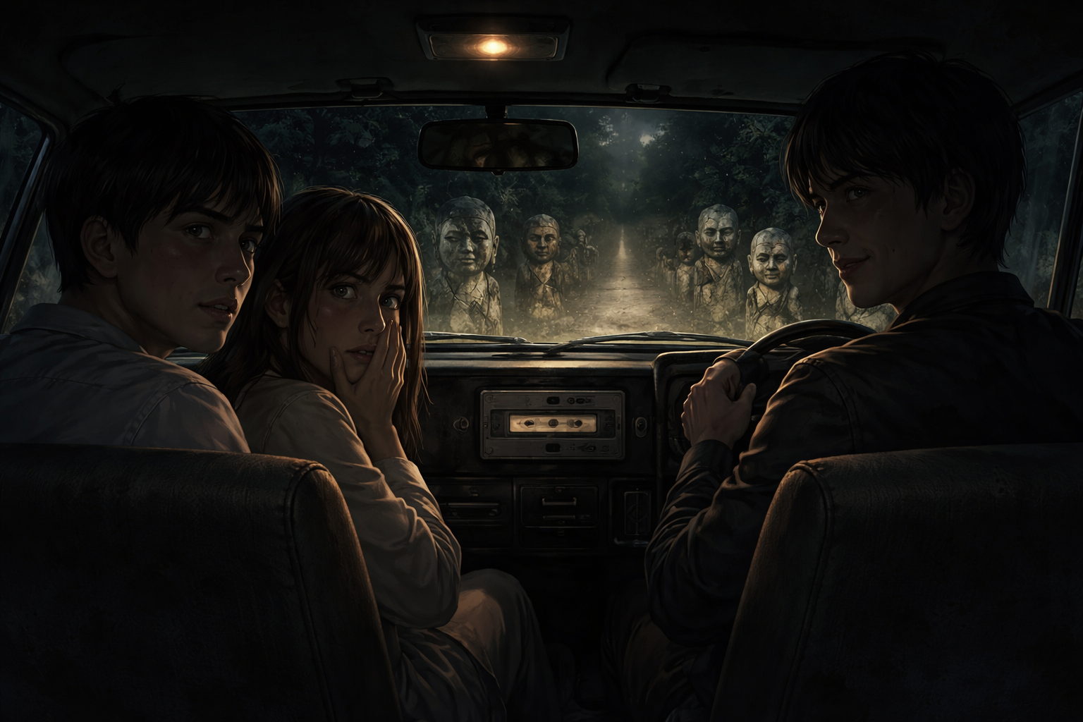 中古の軽自動車。俺と彼女は後部座席に座った。運転自体は丁寧だった。だがしばらく走ると、奇妙な光景が現れた。道路脇に並ぶ石の地蔵。百も二百も、ライトに照らされて次々と浮かび上がる。どれもこれも破損し、顔が割れ、口が裂け、嘲笑っているように見えた。背筋が冷えた。隣を見ると、彼女も青ざめていた。