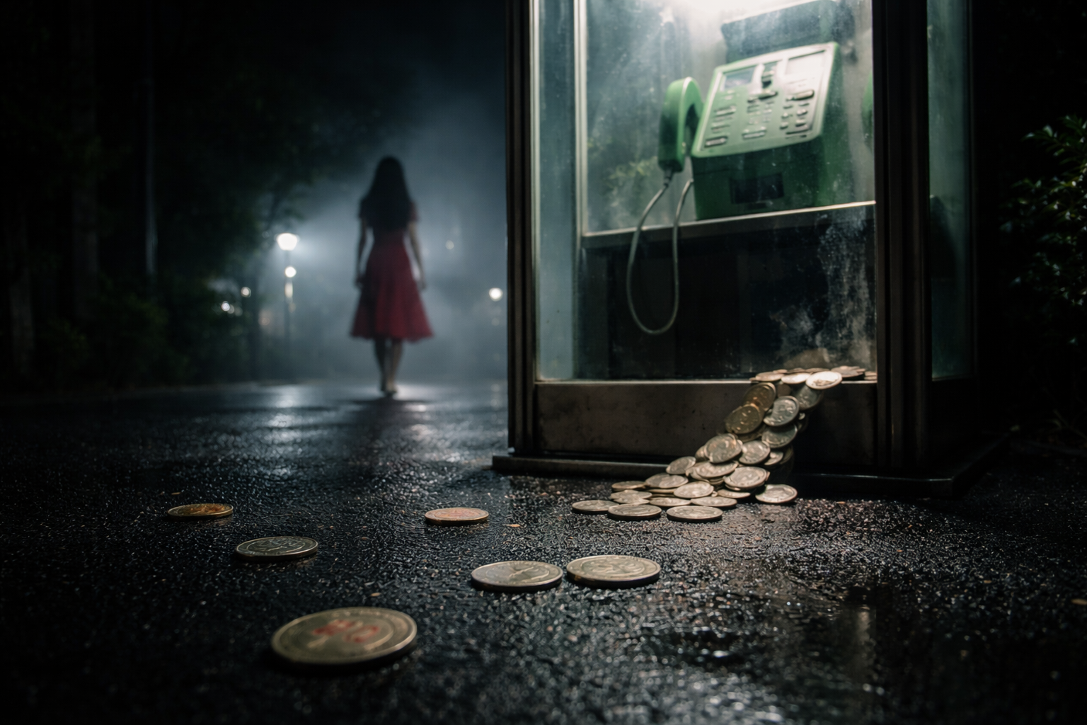 赤いワンピースの女が、電話ボックスから出てくるところだった。長い黒髪が揺れ、顔は見えない。ゆっくりと歩き去る背中は、妙に整いすぎていて、舞台の上の役者のようだった。