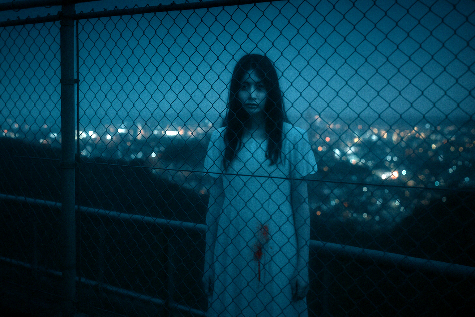 映像を見ている俺と友人は息を呑んだが、その場にいた俺たち自身は何も見ていない。画面の中だけで、女は落ちていったのだ。そして十秒もしないうちに、再び画面右から現れた。今度は白いワンピースが血に染まり、髪は乱れ、皮膚は裂けて腫れ、内臓を引きずっている。だが動作は同じ。俺たちの間を抜け、フェンスをよじ登り、落ちていく。