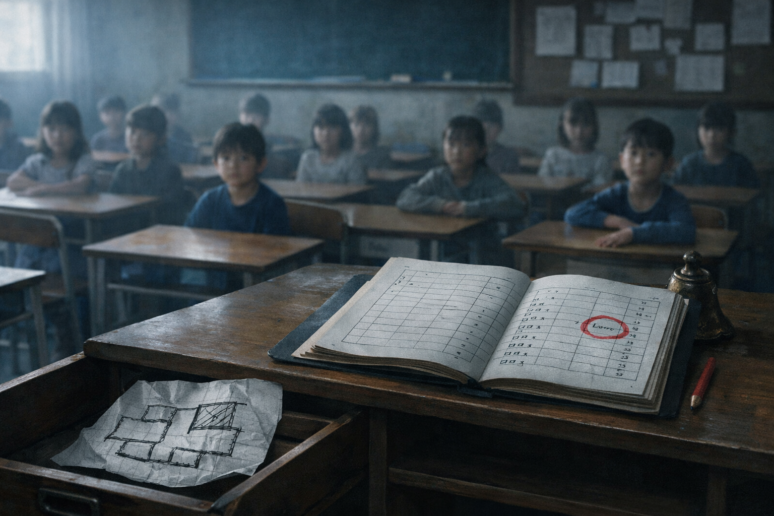 言いながら、教室の机が気になった。みんなの机の引き出しは閉まっているのに、どれも少しだけずれているように見えた。誰かが、ほんの少し引いたあとみたいに。