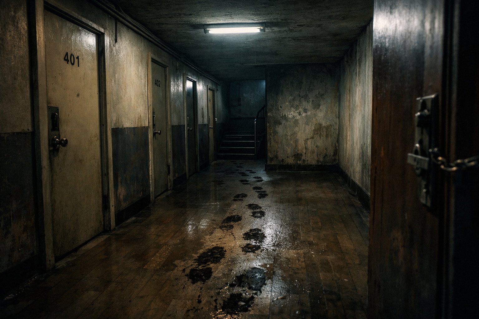 四階に着き、廊下に出た。階段のすぐ横が401号室で、そこから順に402、403と続き、突き当たりが406だ。構造は単純で、逃げ道はない。