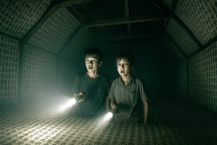 しばらくして戻ってきた彼の手には、懐中電灯が二本。スイッチを入れると、白い光が埃を帯びて空気に刺さるように伸びる。