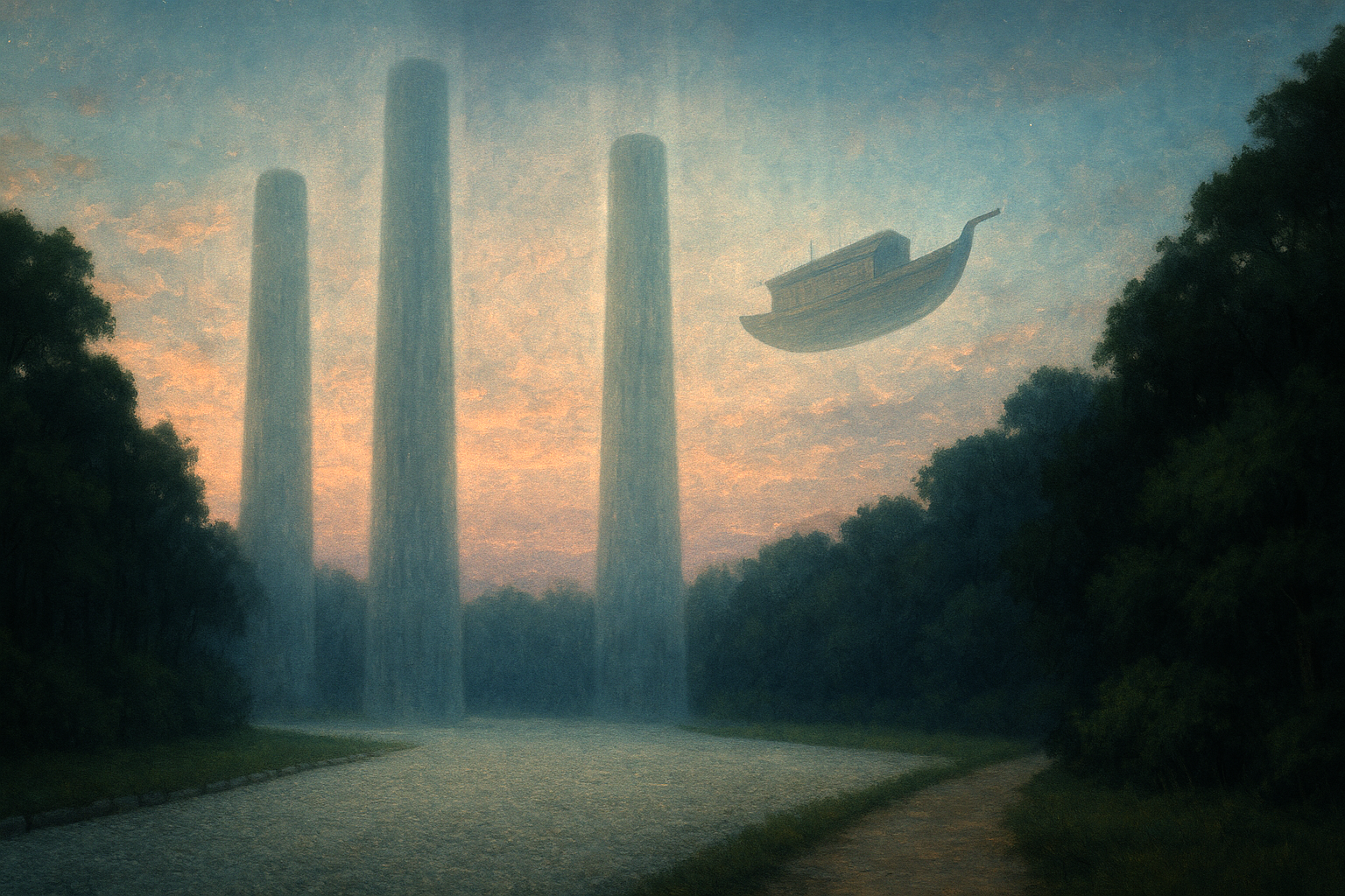 大きな影がゆっくりと流れてきて、右の柱の頂点に触れようとした。ほんの一瞬、空と大地が一つに繋がるような光景だった。だが次の瞬間、船も柱もかき消えるように消え、残されたのはただのひらけた砂利の空き地だけだった。