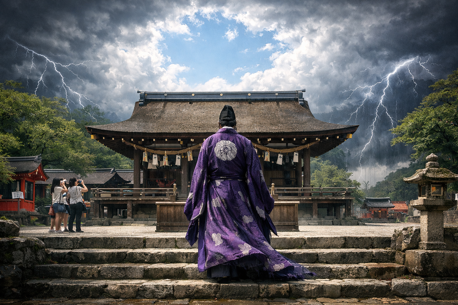 紫地に白紋を染め抜いた狩衣の影が、石段を登っていた。裳は地面を擦り、足元は見えない。身体というより、衣だけが移動しているようだった。影は賽銭箱の前で立ち止まり、賽銭を投じる仕草をした。その所作には迷いがなく、参拝客のそれとも、神職のそれとも違っていた。
