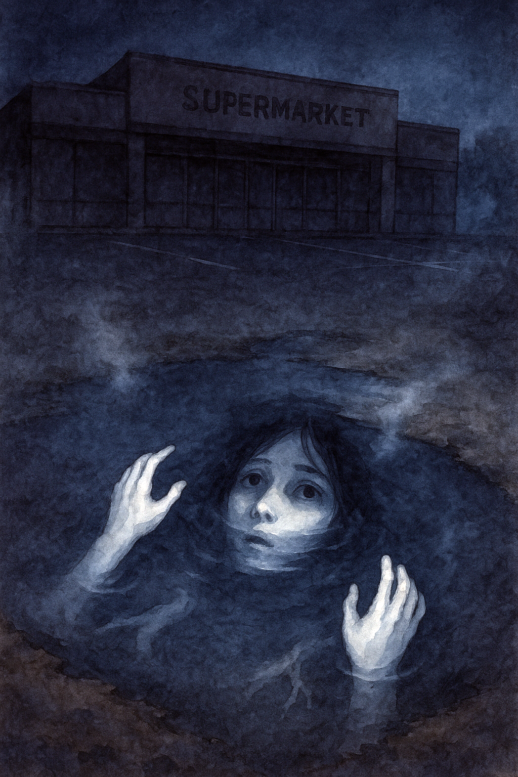 私は逃げ出せなかった。無意識に柵を越え、アスファルトの中央に立っていた。地面に湿り気が広がり、靴底がじゅっと音を立てる。視線を落とすと、水面に私の顔が映っていた。だが映像はすぐに揺らぎ、少女の顔へと変わった。泡を吐きながら、口元に白い肉を押し込まれているあの顔。