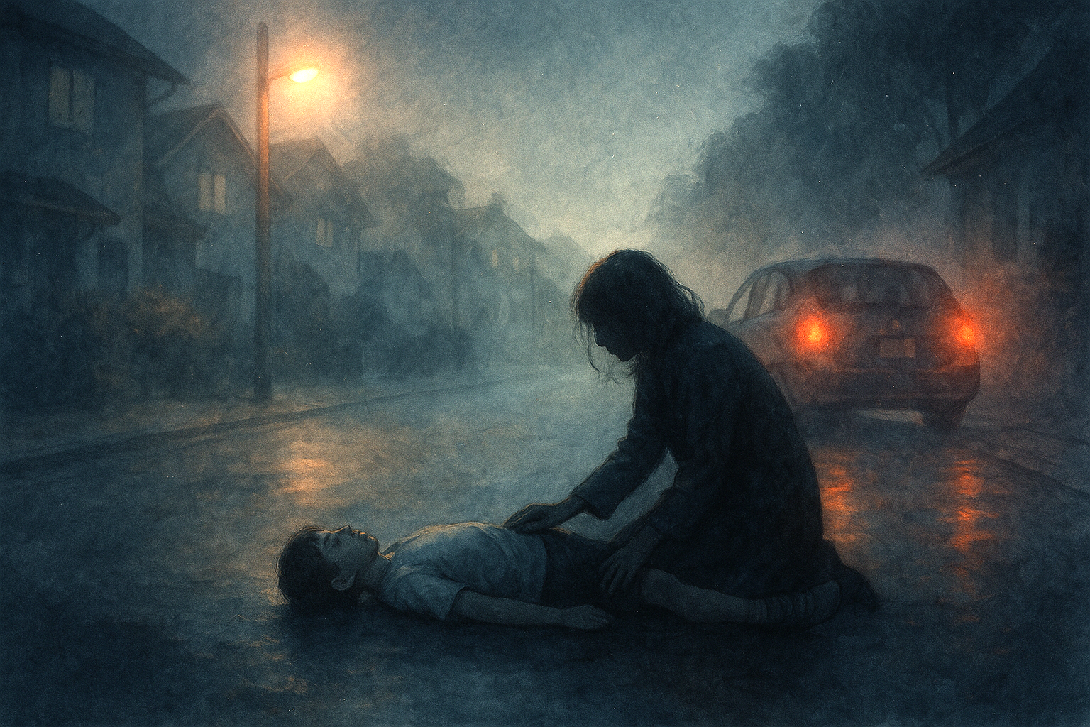 突然、車のエンジン音が狭い路地に響き、猛スピードの車が飛び込んできた。誰もが反射的に身を引いたが、友人の弟だけが間に合わず、衝撃音と共に倒れ込んだ。目撃者たちは声を失い、音の余韻だけが細い道に反響していた。