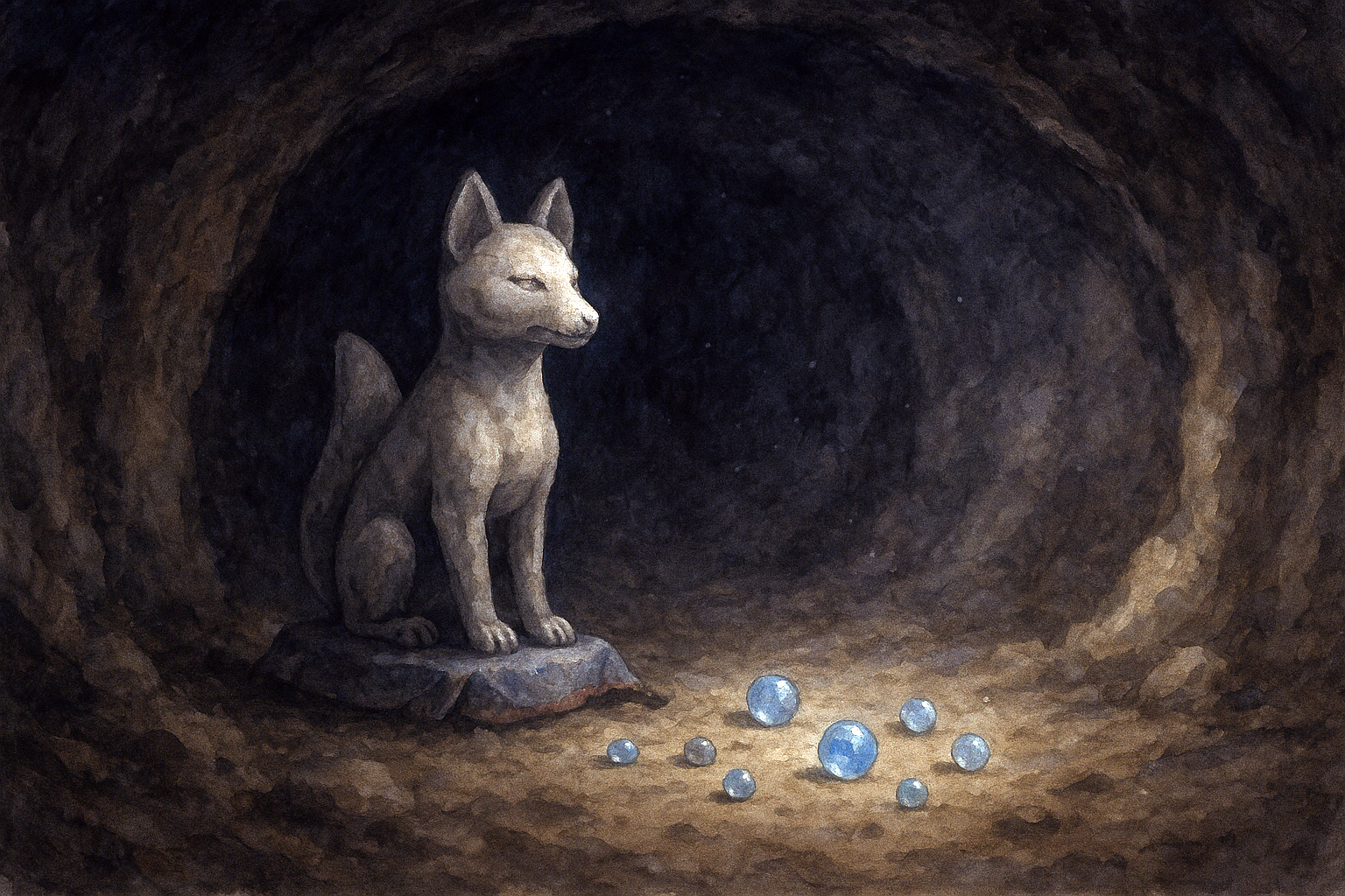 狐の像を囲むように散らばったビー玉を前に、俺たちはしばらく声を失っていた。LEDの光に反射して七色の火が小さく瞬く。洞窟の湿った空気の中で、その光はあまりに鮮やかで、生き物の目のように揺らめいて見えた。背筋に冷えが走り、思わず喉を鳴らした。