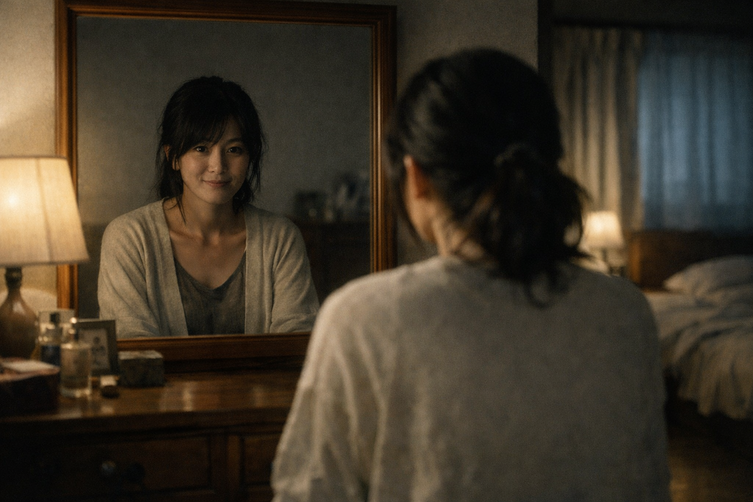 夜、寝室の鏡を見るたびに思う。映る私が、ほんの一瞬だけ笑っているように見える。私が笑ったのではない。あの五年間を生きていた女が、そうしているのだ。