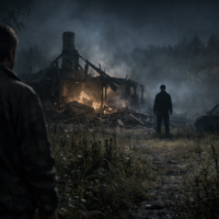 兄が一歩進んだ瞬間、突然悲鳴を上げた。驚いた私は後退し、足元で何かぐにゃりとしたものを踏む感触があった。見てみると、黒い液体が靴にまとわりついていた。その瞬間、私も恐怖に駆られ絶叫し、弟にしがみついて外に飛び出した。兄もすぐに続き、弟が最後に戸を閉めて駆け戻ってきた。