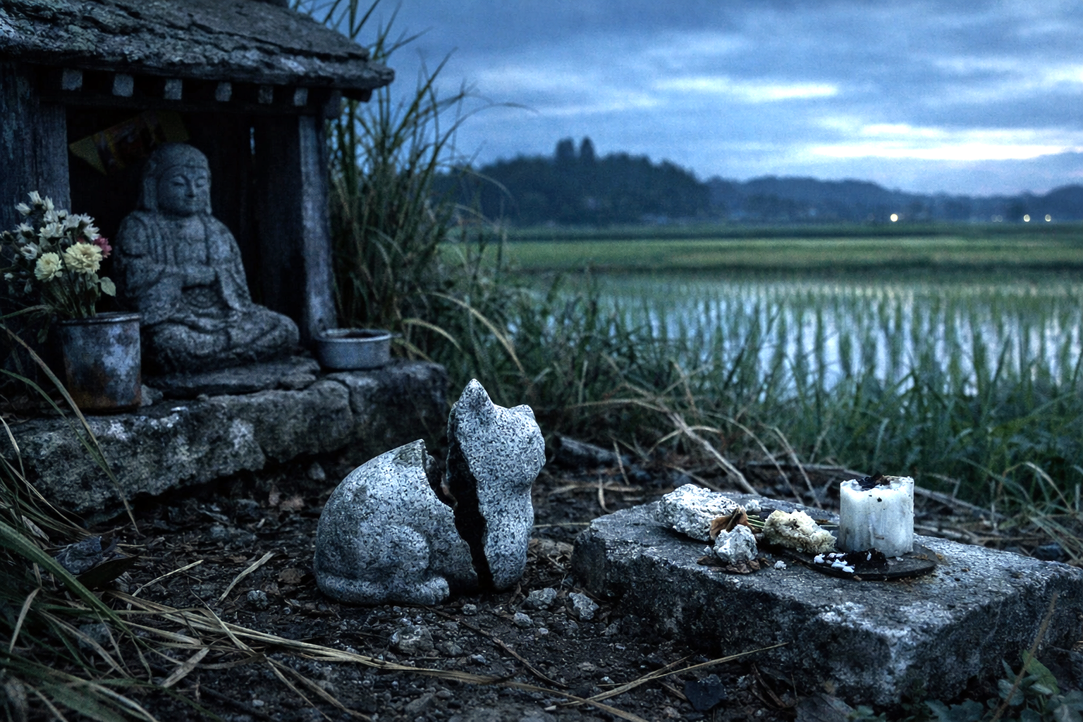私は抵抗をやめた。接着剤で破片を合わせ、祠へ戻した。ひびは消えない。線のように残る。手を合わせ、言葉を探し、何度も頭を下げた。