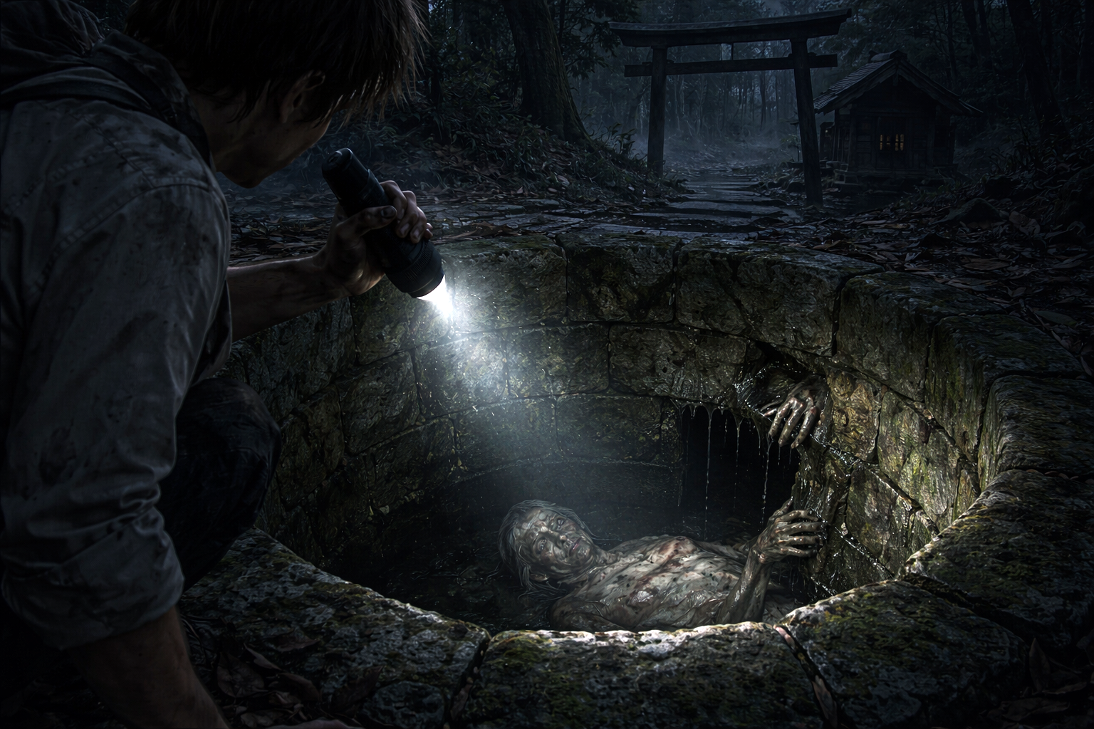 山の奥に、朽ちかけた社がある。傾いた鳥居と、苔むした石段。その裏手に、古井戸があった。