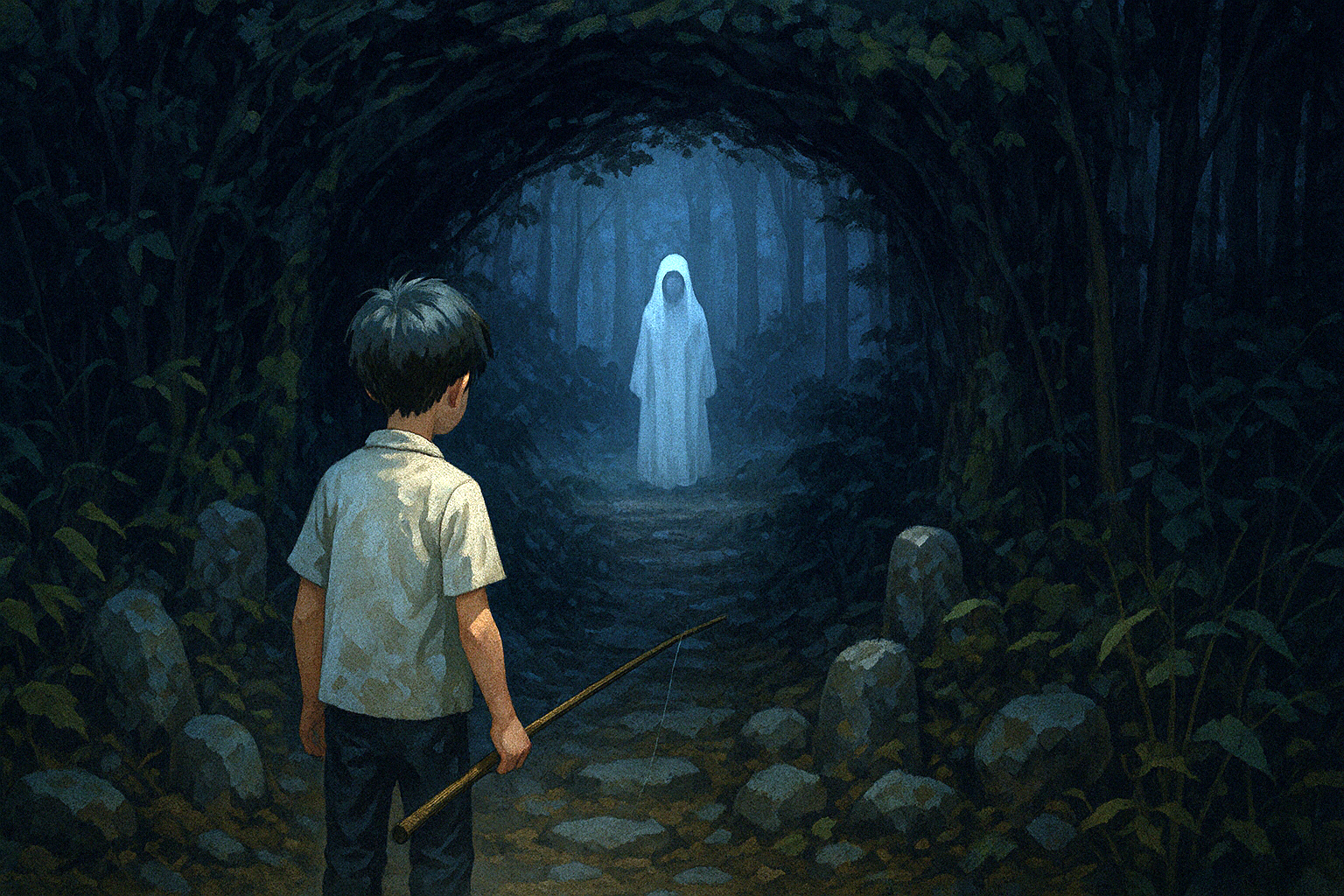 ある日、祖父母が町へ買い物に出かけ、私は一人で留守番をすることになった。やることもなく、結局釣りに出かけることにしたのだが、その日、私は禁じられていた抜け道を通った。
