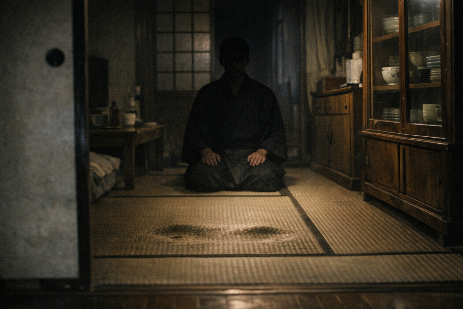 男だった。正座をしている。食器棚の前で、背筋を伸ばし、こちらを見ていた。顔はよく見えない。ただ、視線だけがはっきりと分かった。