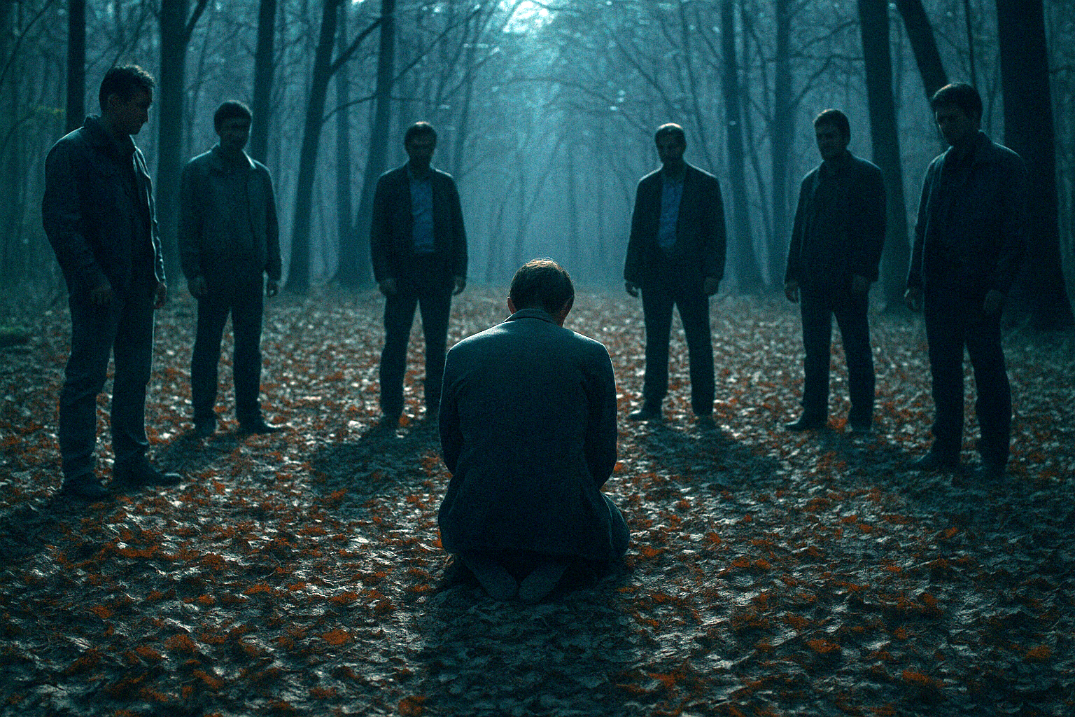 木々のざわめきに包まれた山の奥、落ち葉が厚く積もった広場に出ると、そこにいたのは正座する長谷山さん、そしてそれを取り囲む虻川、岩井川、八柳、そして見知らぬ男たち数人。まるで芝居の舞台の中央に放り出されたような光景だった。