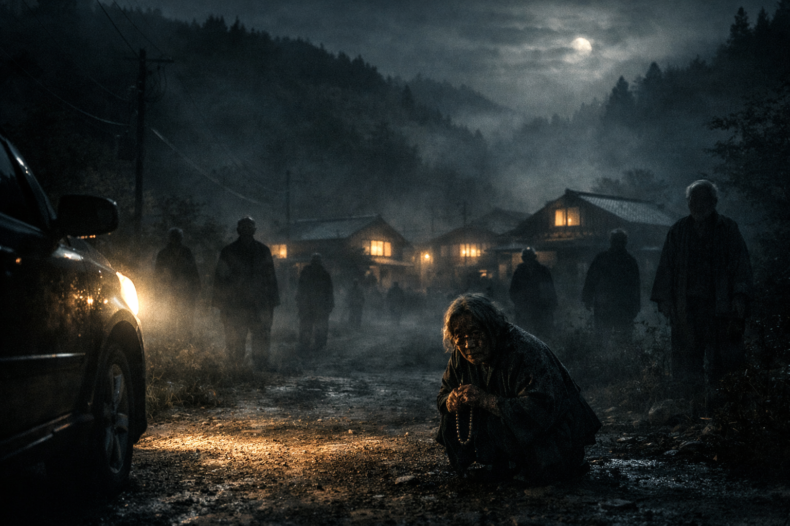 やがて、闇の奥にぼんやりと明かりが浮かび上がった。家々だ。ほっとして、そのうちの一軒の前に車を停めた。エンジンを切り、タバコに火をつける。一本吸い終え、ドアを開けた瞬間、身体が固まった。