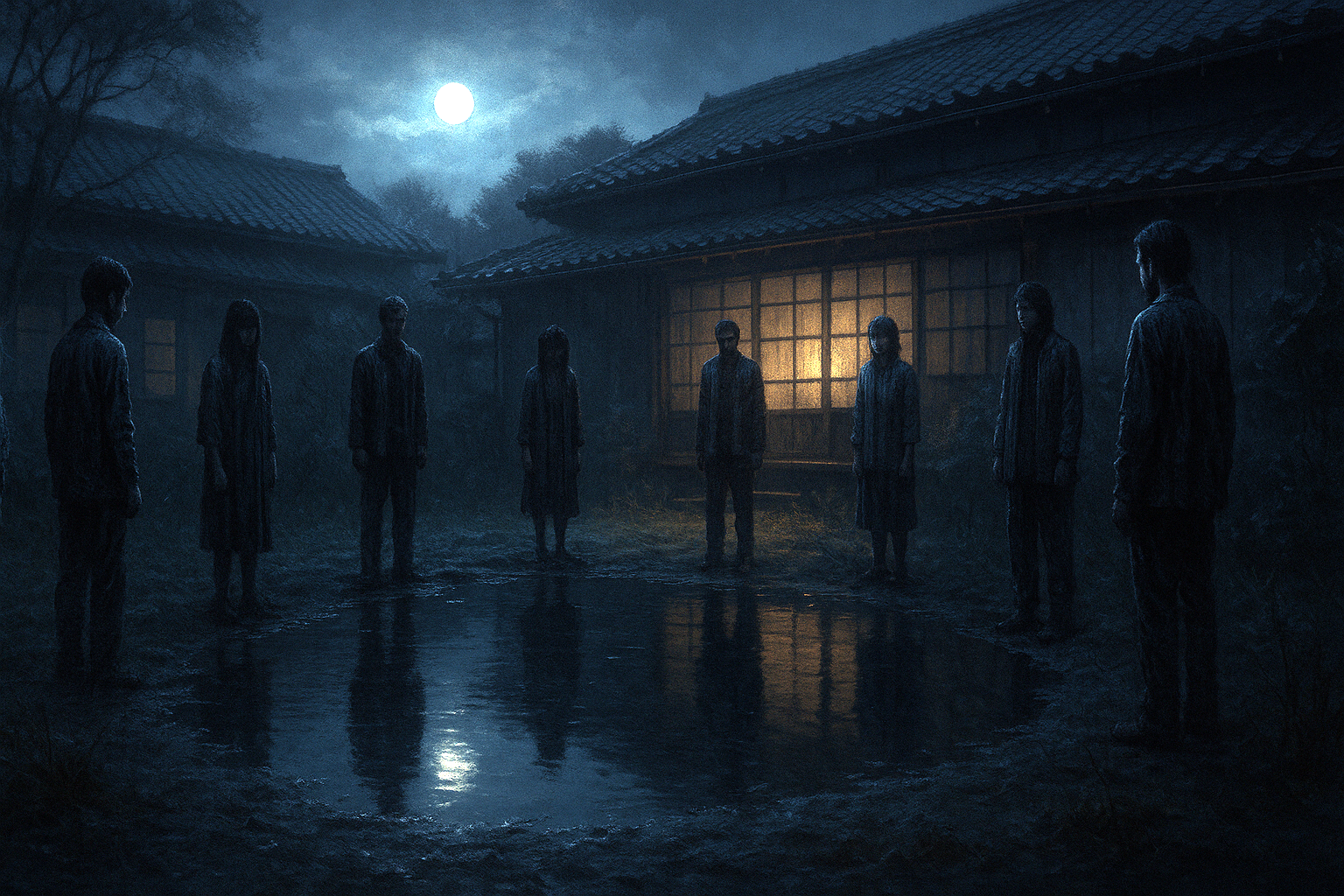 恐怖で窓に近寄れずにいた私の耳に、低く湿った声が届いた。覗くと、庭の水溜まりを囲むようにずぶ濡れの人々が立っていた。子供も大人も、二十人以上。誰も瞬きせず、水面を凝視している。