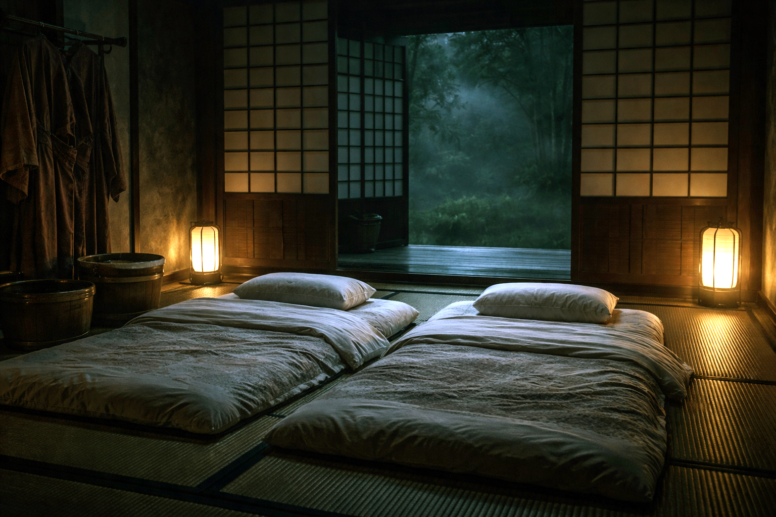 連れていかれたのは、裏手の使われていない離れ。板の間に畳を敷き、布団が二組並んでいる。枕も二つ。桶に水が張られ、衣桁には女物の着物。障子の向こうは真っ暗だ。