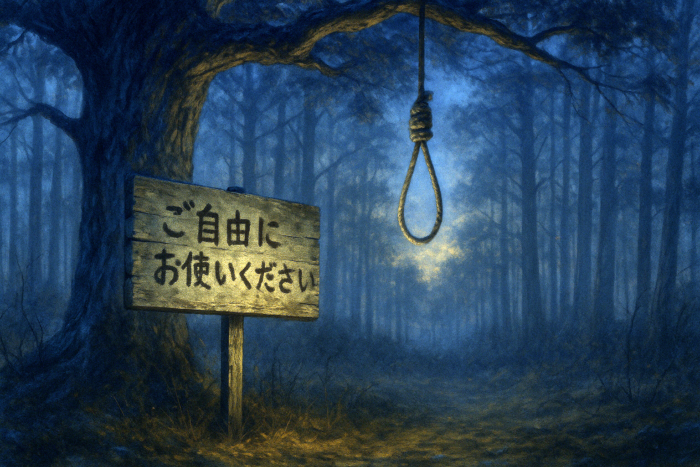 次は、通勤途中の街路樹だった。信号待ちの間、ふと見上げた枝に、ロープの輪のような影が見えた。瞬きすると消えた。