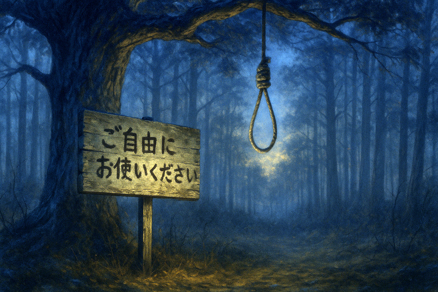 用意したのは板と杭、それからロープ一本。板に杭を打ちつけ、拙い字で「ご自由にお使いください」と書く。ロープは端を結んで輪っかを作る。それだけで即席の絞首台の完成です。想像しただけで、番組のスタジオの笑い声が耳に響く気がしました。
