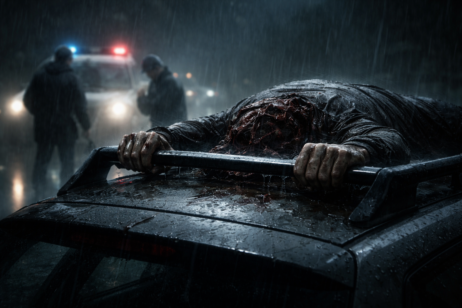 ルーフキャリアの上に、遺体が横たわっていた。頭部は潰れている。顔の判別はつかない。だが両腕だけが、不自然に持ち上がっていた。