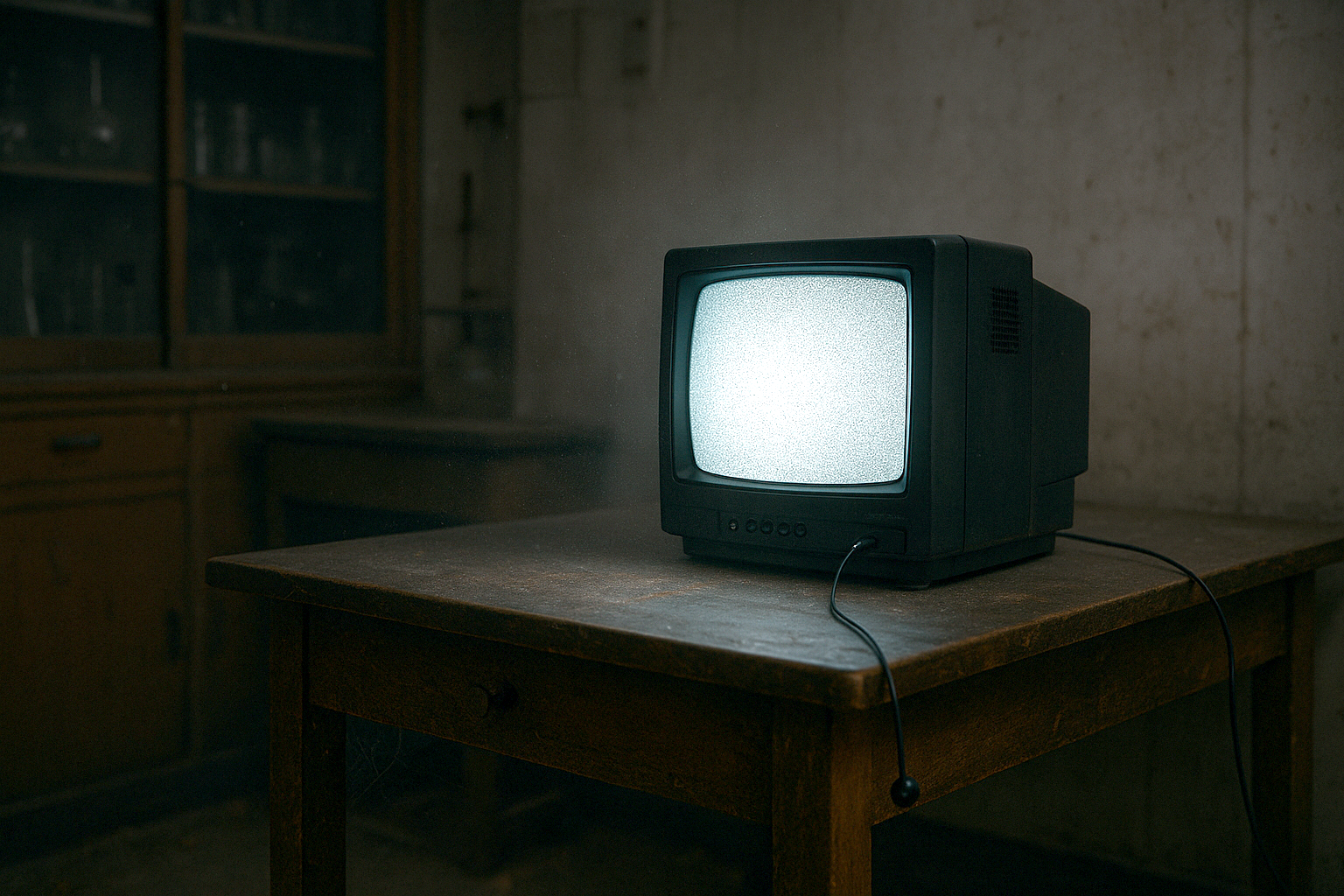 壁際に古い机、その上に小さなブラウン管テレビ。