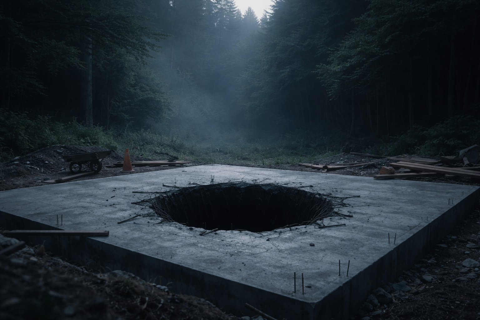 翌朝、全員が言葉を失った。固まったはずのコンクリートの中央に、また同じ穴が開いていた。破片はなく、足跡もない。何かが通った痕跡だけが、きれいに消えていた。