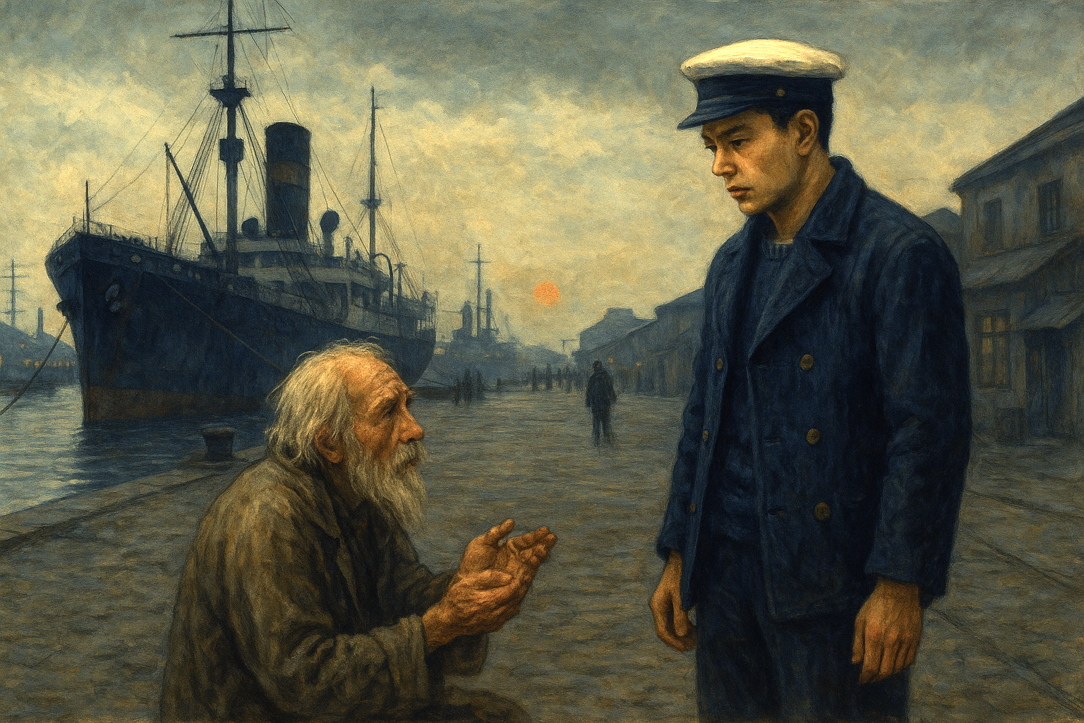 夕暮れ、港の灯りが水面に揺れるころ、その男のもとへひとりの老人が現れた。