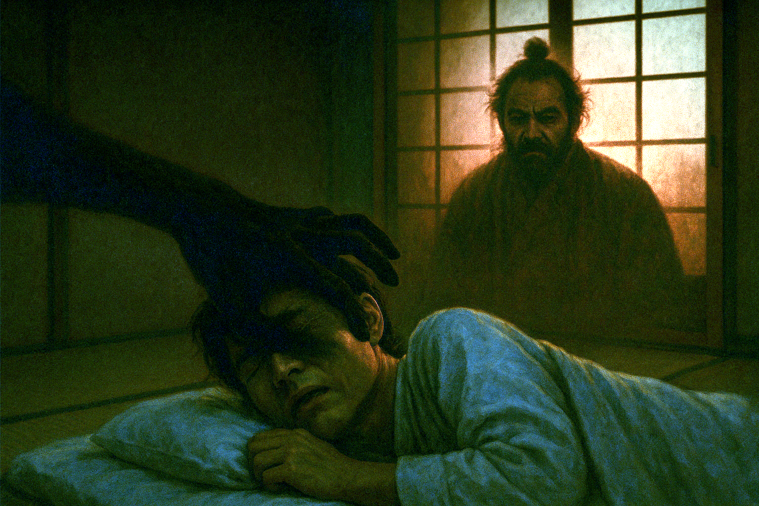 そこにあったのは、髭だらけで髪を結い上げた浪人のような顔だった。大きな指の隙間から覗くその相貌を見た瞬間、恐怖よりも強い怒りが湧き上がった。私は「うおおおおお!!」と叫び、吠えるように男を睨みつけたのだ。圧迫は解け、顔はすうっと消え、身体は自由を取り戻した。跳ね起きた私は、なおも「待てこの野郎!」と叫んでいた。
