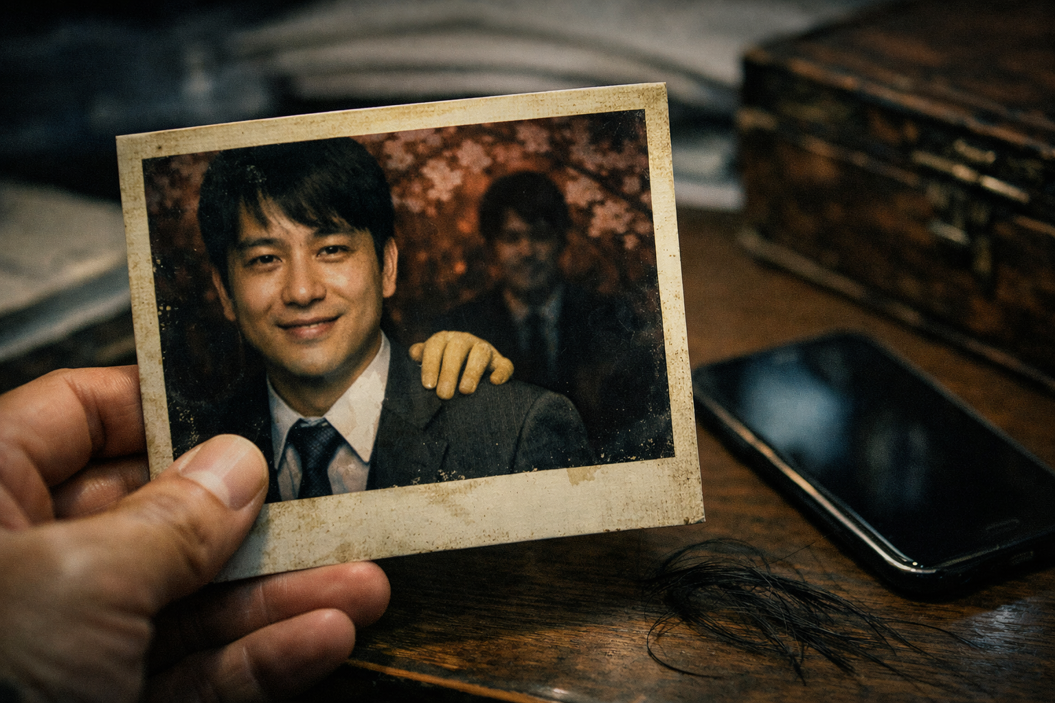 あのポラロイドは、最初は飯島の肩にだけ手があった。何年もそうだった。だが、見返すたびに位置が変わる。最初は肩口だった指先が、次に首筋にかかり、今は背中の後ろから覗き込むように写っている。