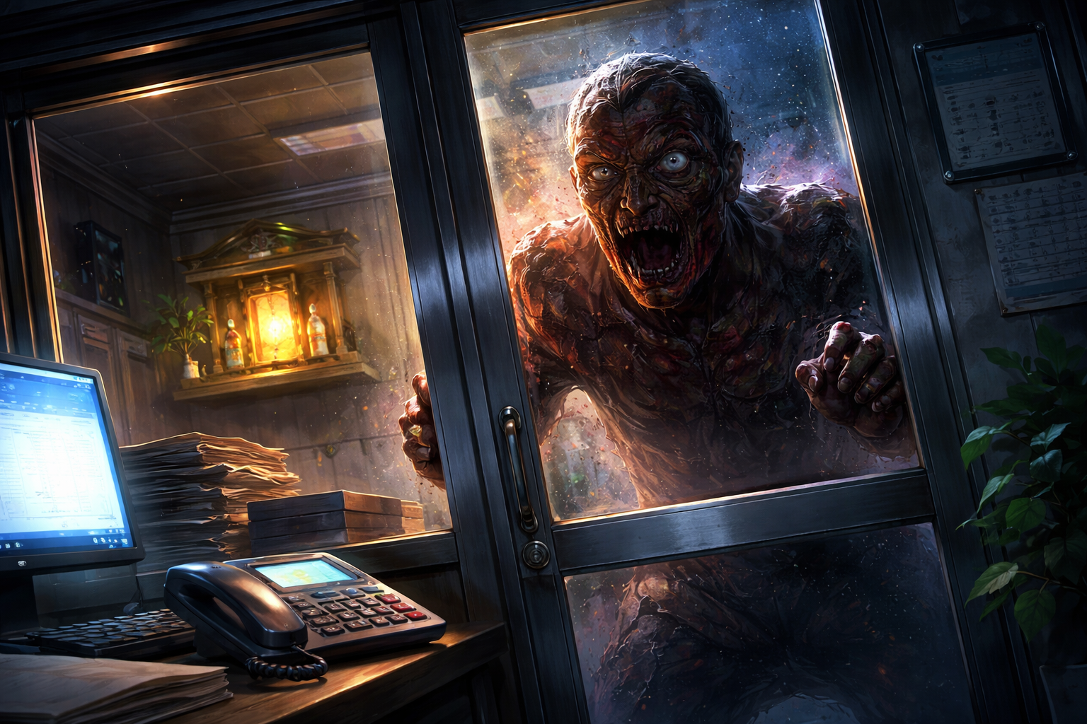 最近、残業中に電話が鳴ることがある。受話器を取ると、何も聞こえない。ただ、向こうで扉を叩くような低い振動音だけが続く。