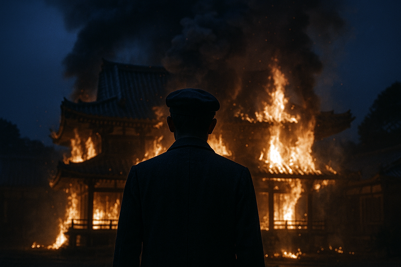 双竜寺が燃えている、と誰かが叫んだ。私は桶を投げ出して駆けつけた。炎は木造の堂を舐めるように広がり、不動堂とそこへ通じる廊下を残して、ほとんどが炭のように崩れ落ちていった。