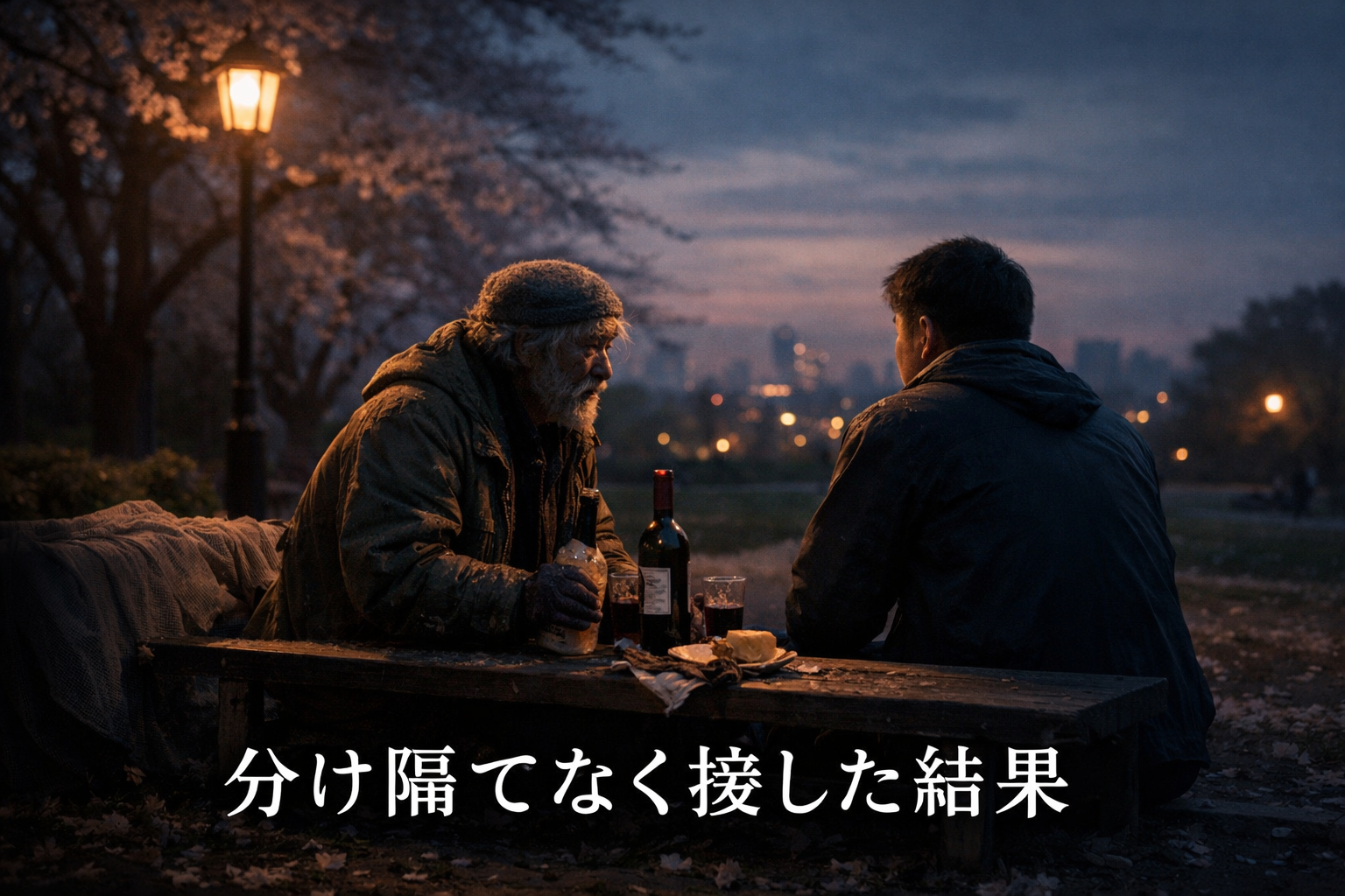 季節が一巡する頃、その公園にいつもいる一人の男と顔見知りになった。年の頃は六十代半ばだろうか。段ボールと毛布で寝泊まりしているらしく、いわゆるホームレスだった。ただ、身なりこそ汚れていたが、背筋が伸び、言葉遣いは妙に丁寧で、どこか育ちの良さを感じさせた。