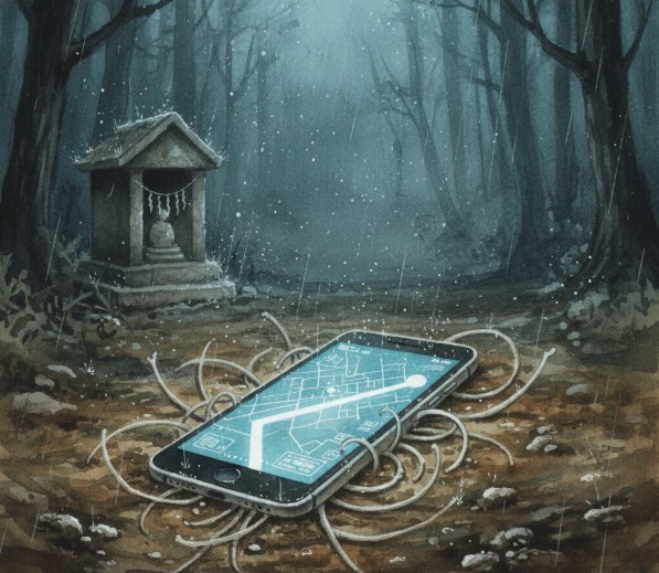 私は家の脇を通り抜け、裏山へ続く細い小道へ足を踏み入れた。靴底が濡れた土を噛む感触が足首にまで伝わってくる。じゃり、じゃり、と砂利が鳴り、その音が心拍と重なる。スマートフォンの画面が不意に明度を落とした。バッテリーは十分なはずだ。だが地図はノイズが走ったように歪み、目的のポータルが点滅を繰り返している。警告なのか、手招きなのか判断がつかない。