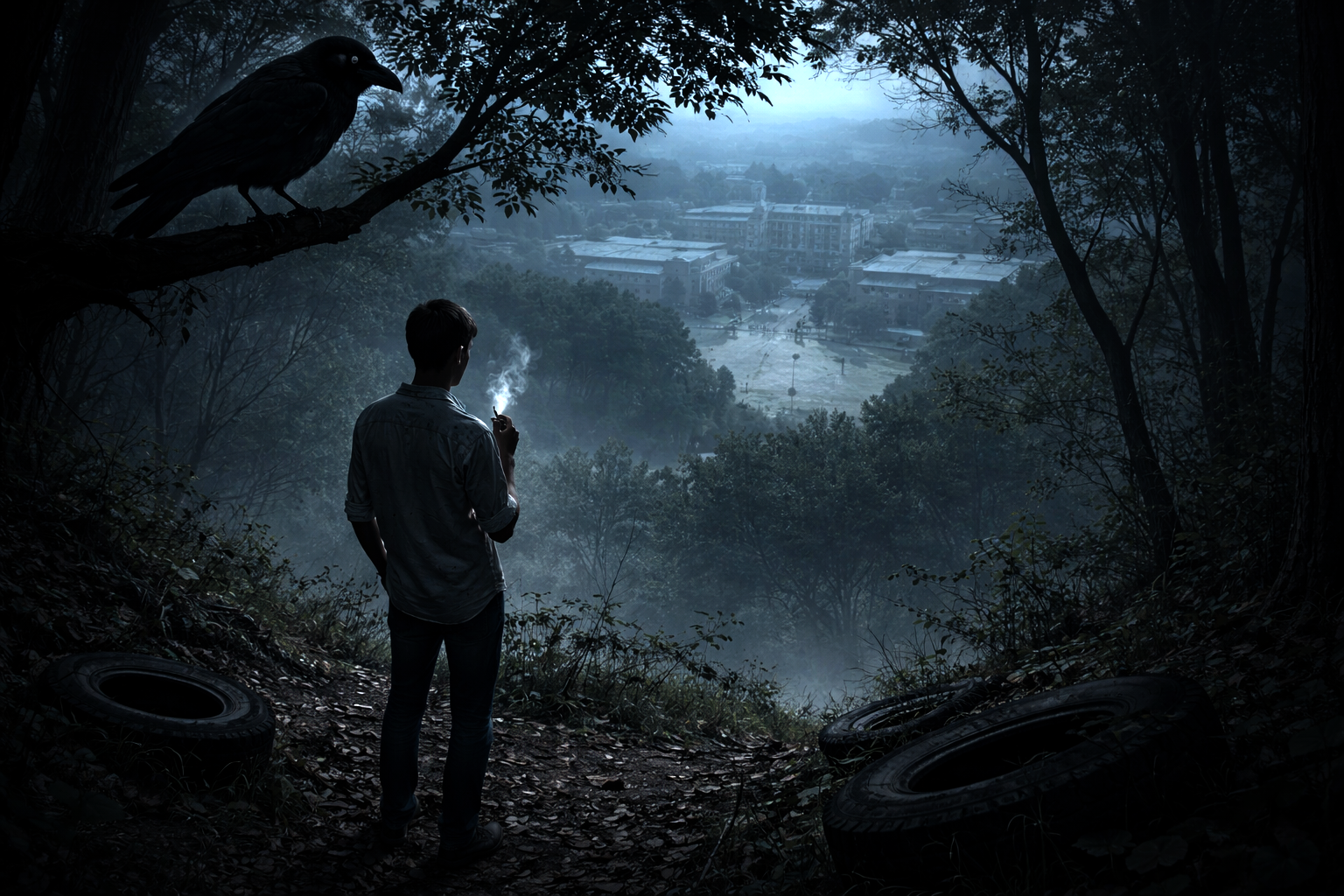 視界の開けた場所からは、眼下に大学のキャンパスが一望できた。箱庭のような校舎。蟻のように行き交う学生たち。彼らのざわめきや、どこかのサークルが練習しているブラスバンドの音色――その日は確か、『威風堂々』だったと思う――が、風に乗って断続的に届いていた。遠くを走る国道のトラックの走行音、タイヤがアスファルトを噛む乾いた摩擦音。それらはすべて、ここまでは届かない「向こう側」の出来事として、安全な距離感を持って響いていた。