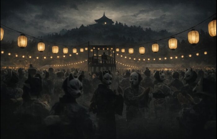 会場は神社の近くで、御神輿の周りを囲むように、面を被った人たちが盆踊りをしていた。狐、ひょっとこ、般若。笑ってるようで笑ってない、あの面特有の無表情。提灯の赤い光が面の凹凸に影を作って、目だけが暗く見えた。
