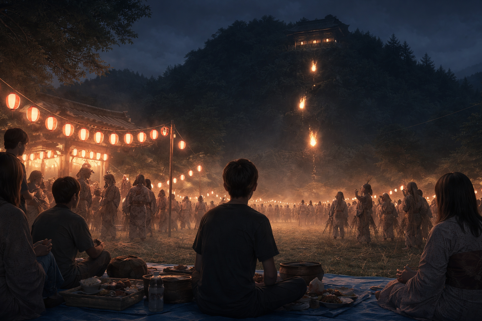 最初は「遅れてるのかな」と思った。屋台の声、太鼓、盆踊りの輪。周囲は盛り上がっている。なのに空だけが、ずっと同じ。黒い紙に穴を空けたような夜空。