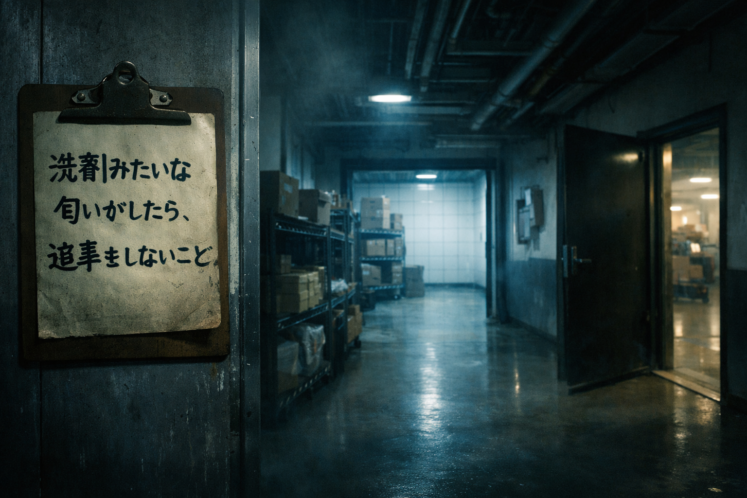 角を曲がると、倉庫のような空間に出た。ラックが並び、梱包材が積まれている。埃はない。だが人の気配もない。