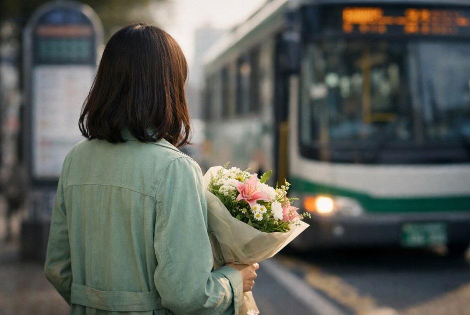 「バスの中で。同じコートを着ていましたよね。花束も持っていて」