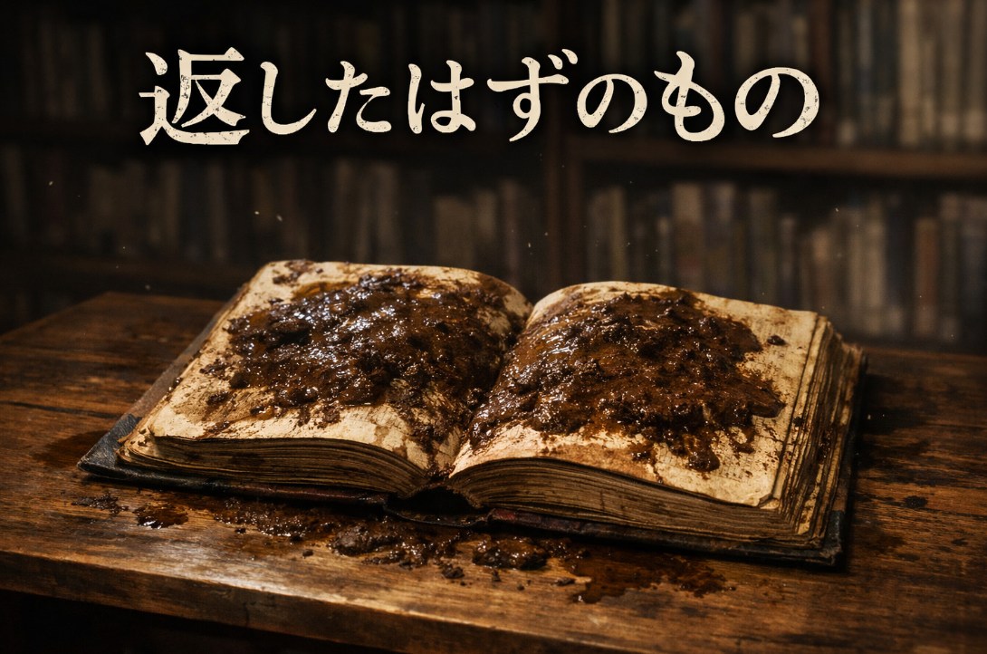 文字も挿絵も見えない。泥は乾いておらず、指で触れるとぬるりと広がった。机の上も手も一瞬で茶色に染まり、匂いが鼻の奥にまとわりついて離れない。私は声も出せず、ただ必死にティッシュで拭き取った。