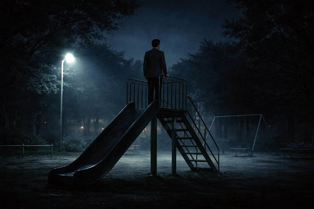 小さな児童公園で、ブランコと砂場と、古い滑り台がひとつあるだけだ。昼間は子どもと母親で賑わうが、夜は完全に放置される。街灯は一本だけで、滑り台の踊り場が中途半端に照らされていた。