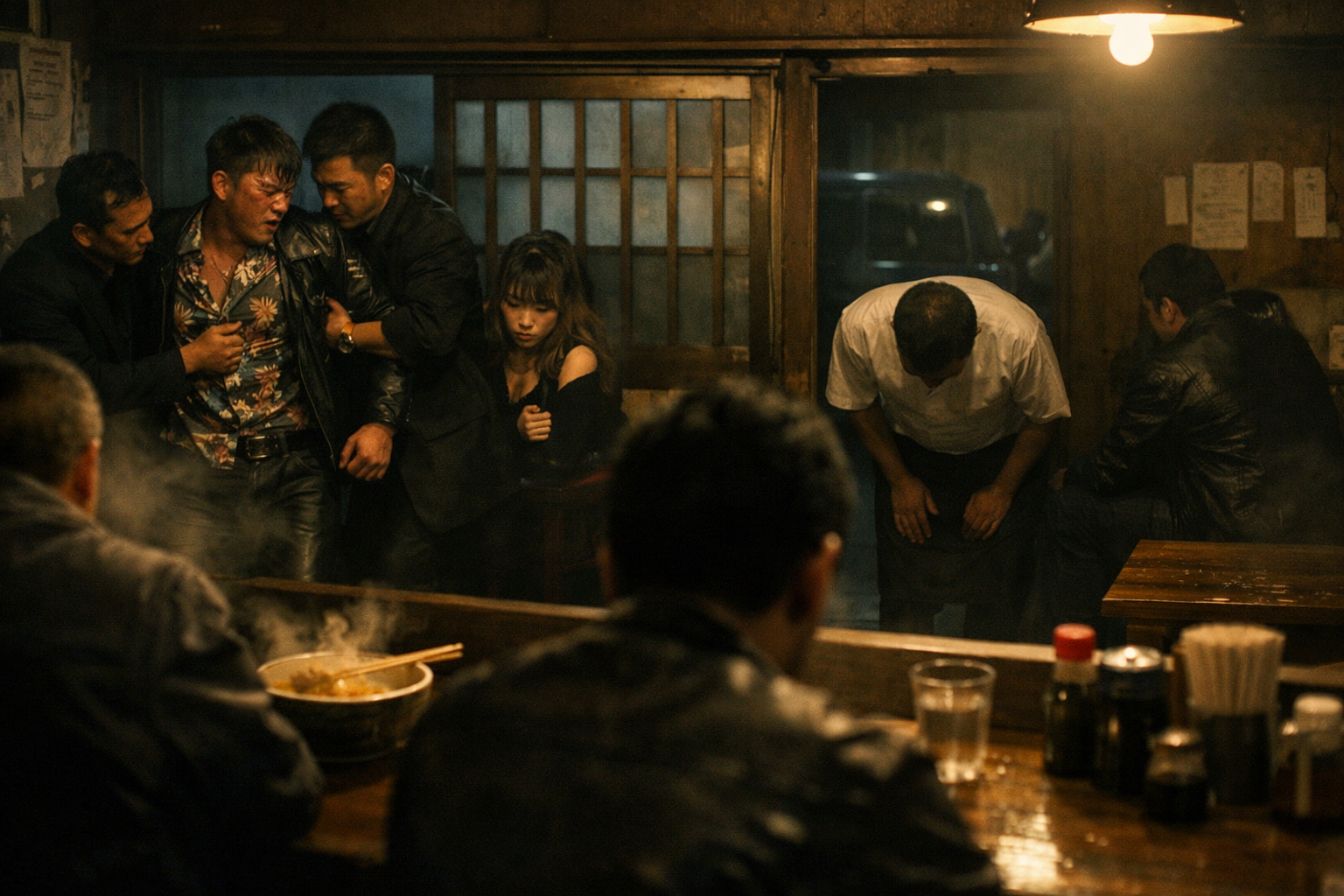 音が大きすぎて、店全体が一瞬、息を止めたように感じた。入ってきたのは男と女だった。男は派手な服装で、革ジャンを無造作に羽織り、顔には古い傷がいくつも残っている。女は濃い化粧で、視線を合わせようとしない。