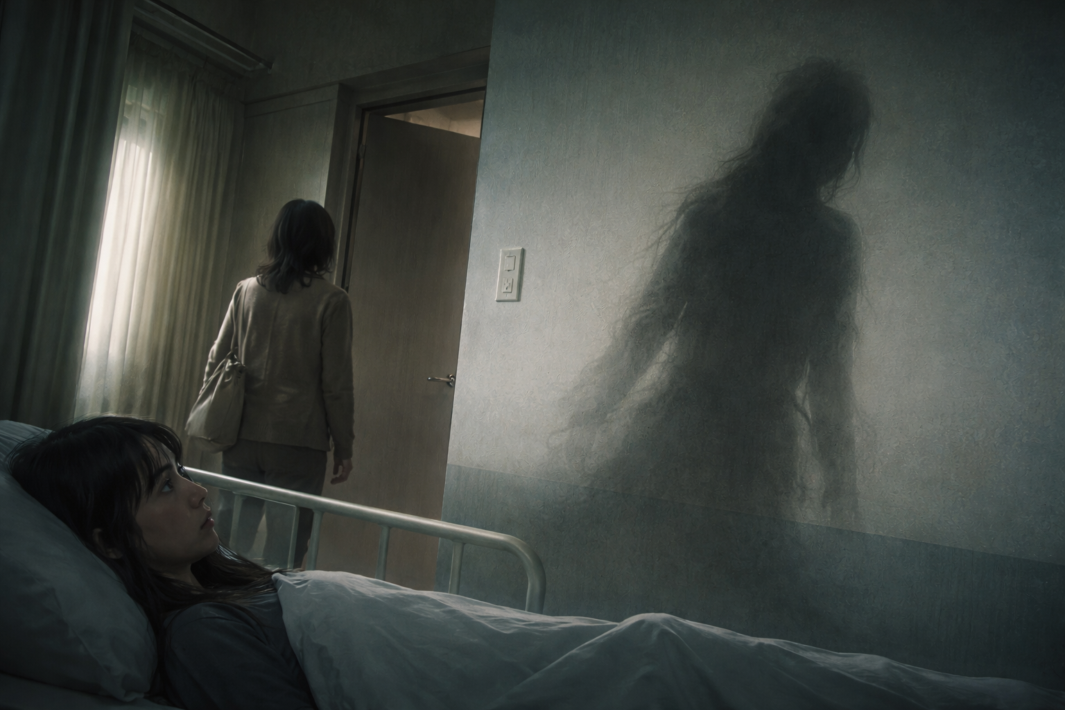 母が病室を出た瞬間、床に落ちる影の縁がぴたりと止まった。胸の奥の拍動も、同時に消える。