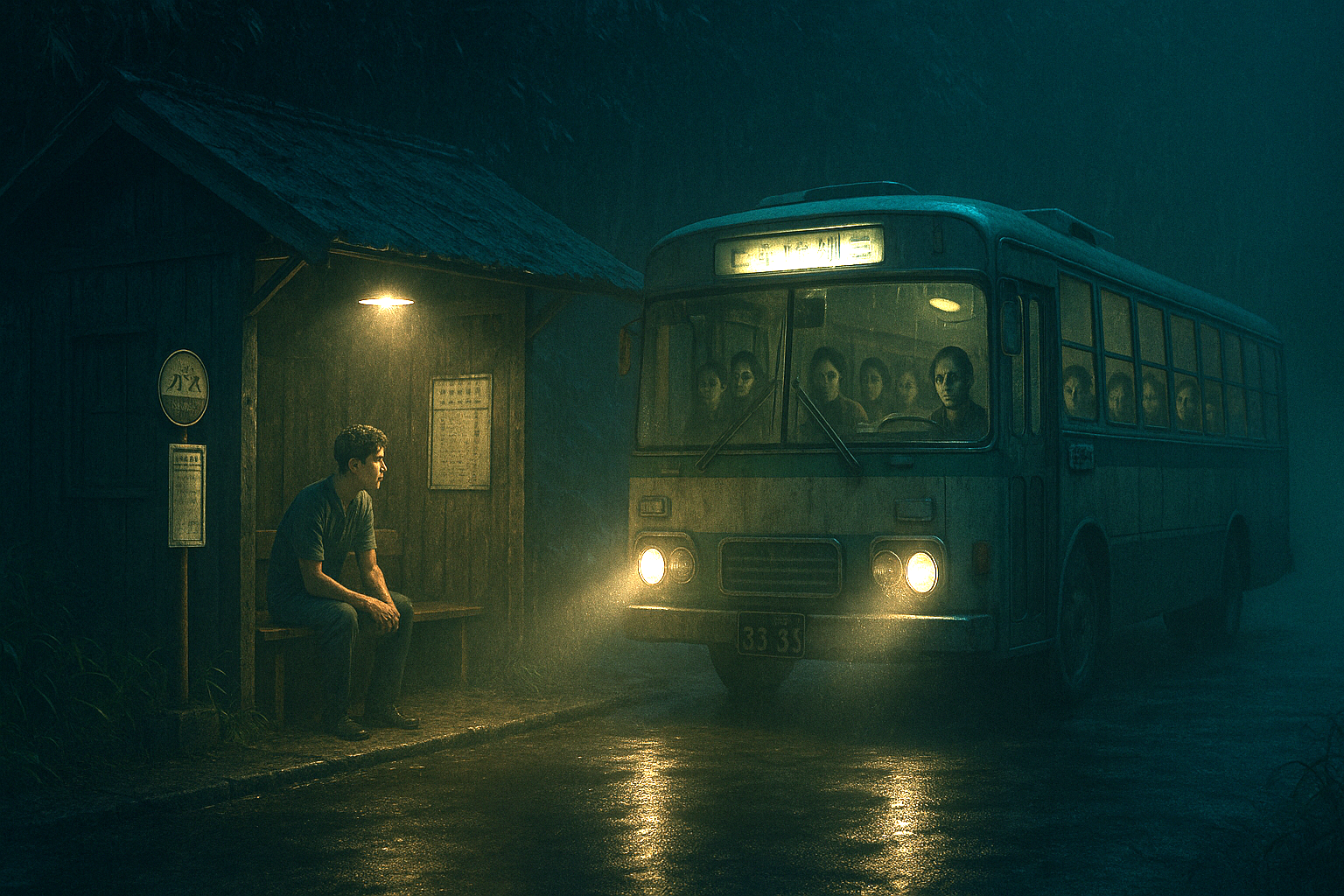次の瞬間、ヘッドライトがふっと消えた。闇に沈んだ停留所に、私の荒い呼吸だけが残った。振り返ると、竹藪は静まり返り、虫の声さえ途絶えていた。